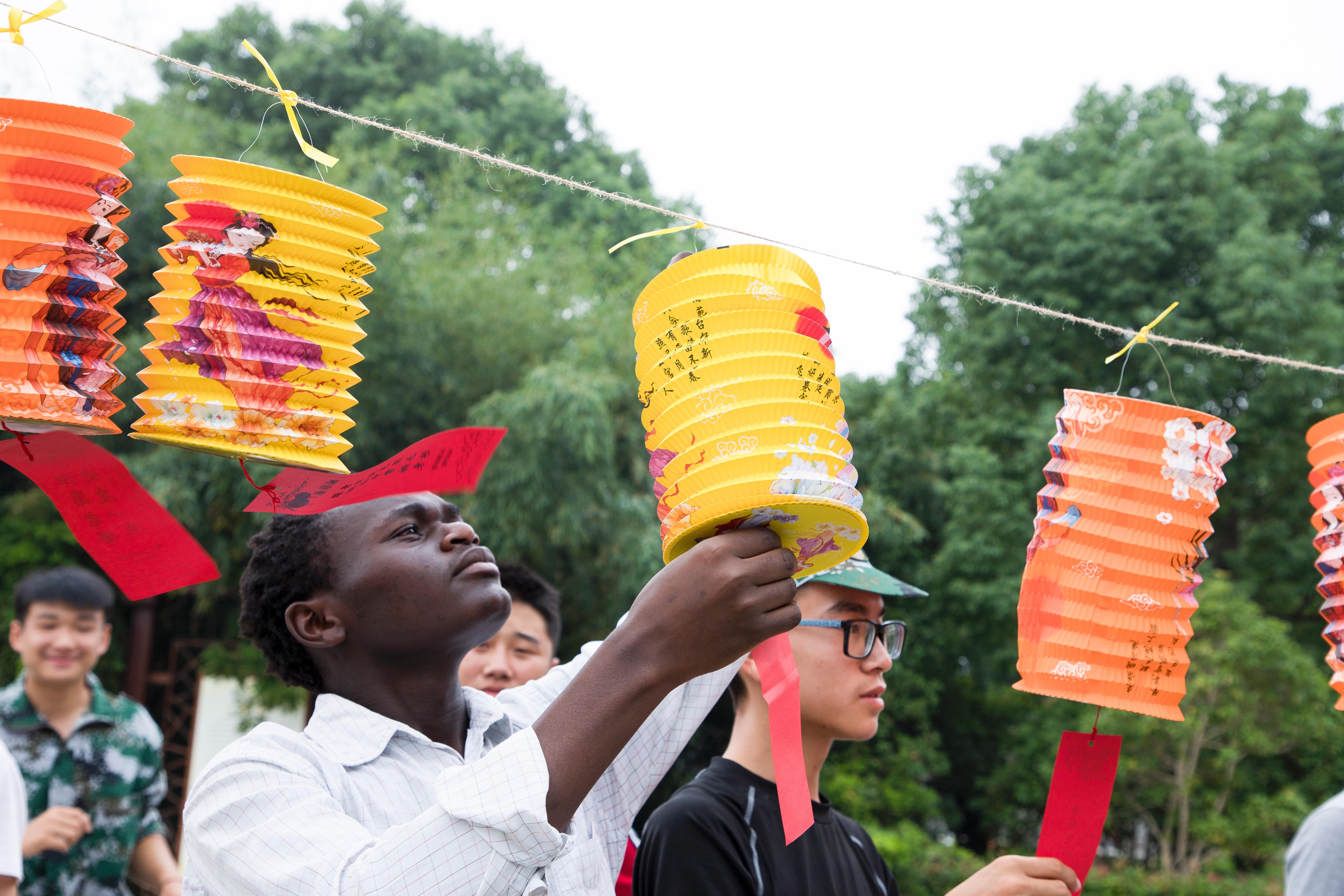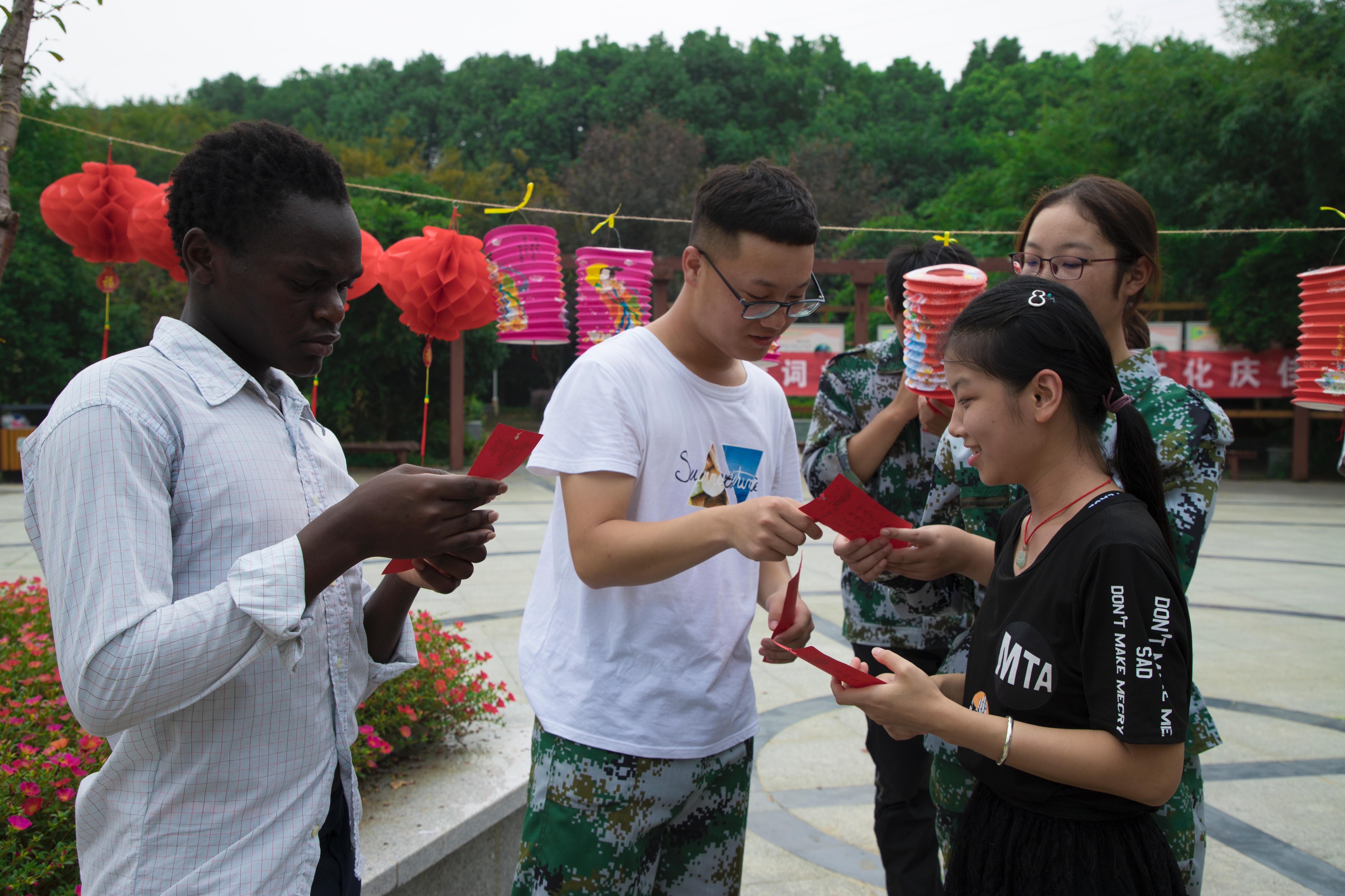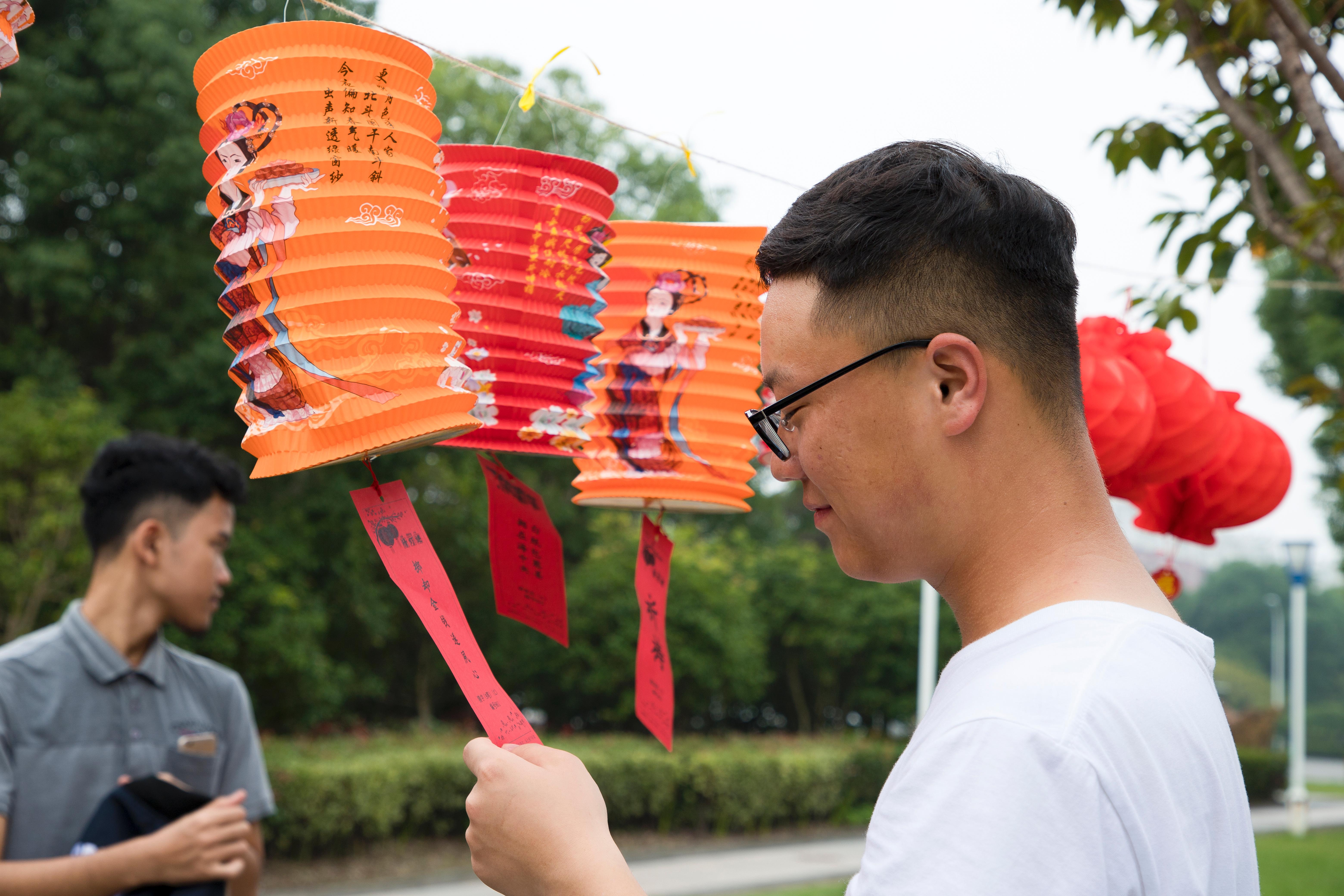 活动分为“诗词飞花令”、“趣味灯谜会”、“印象中秋”三个环节。“诗词飞花令”让在场的大一新生们大显身手;一个个含有灯谜的灯笼悬挂在校园励志广场的树上,大家被精心挑选趣味灯谜所吸引,驻足思考,你一言我一语,场面热闹非凡;印象中秋现场,同学们席地而坐,纷纷讲述了自己印象中的家乡中秋节。最后,两个留学生用汉语朗诵了苏轼的《水调歌头.明月几时有》,饱含深情的朗诵赢得了在场同学们的阵阵掌声。