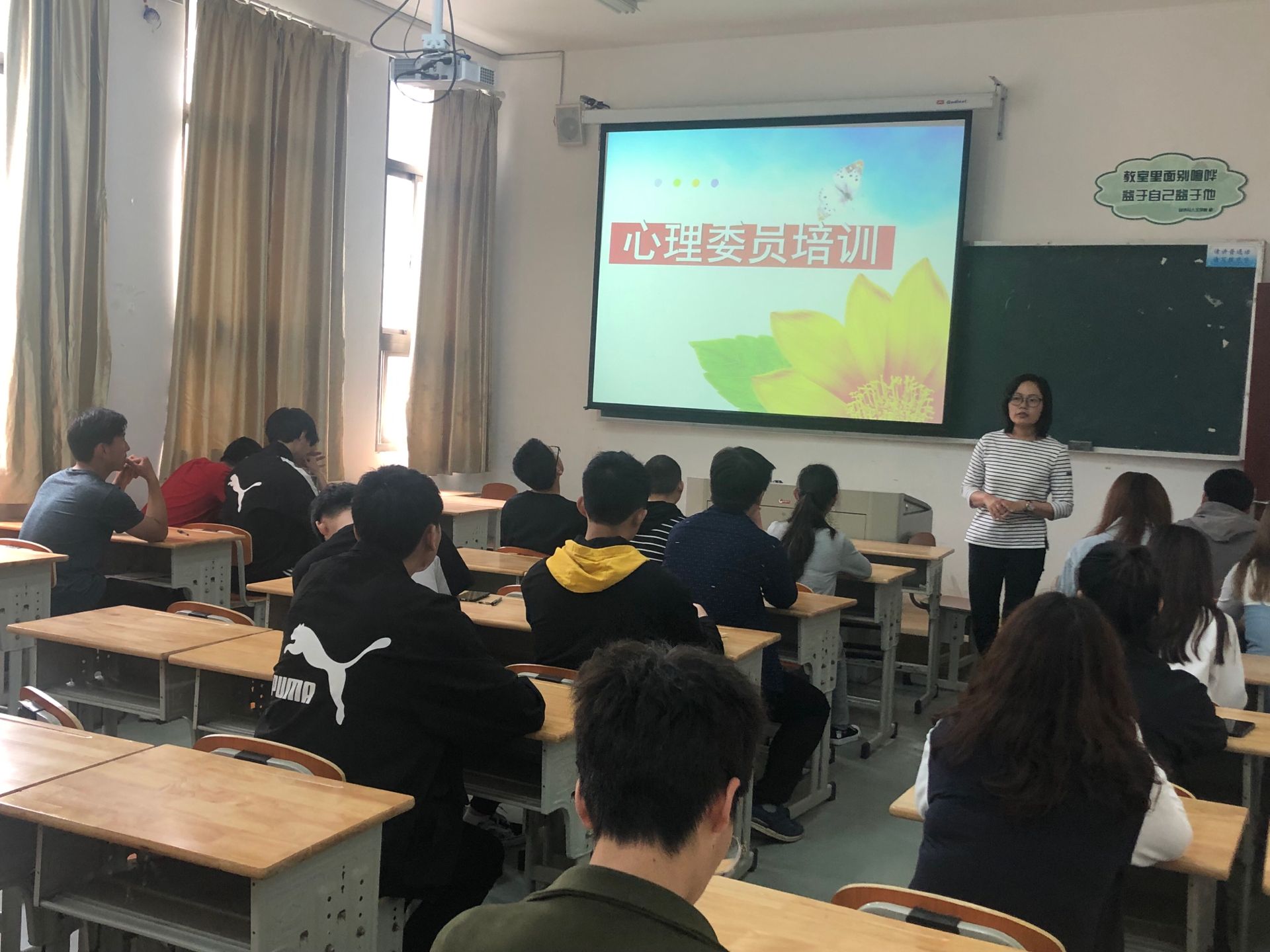 此次培训由戴瑶老师进行指导,对大学生在校期间的心理工作的内容和展开方式进行探讨和布置,让心育干部了解自己的职责和工作方法。