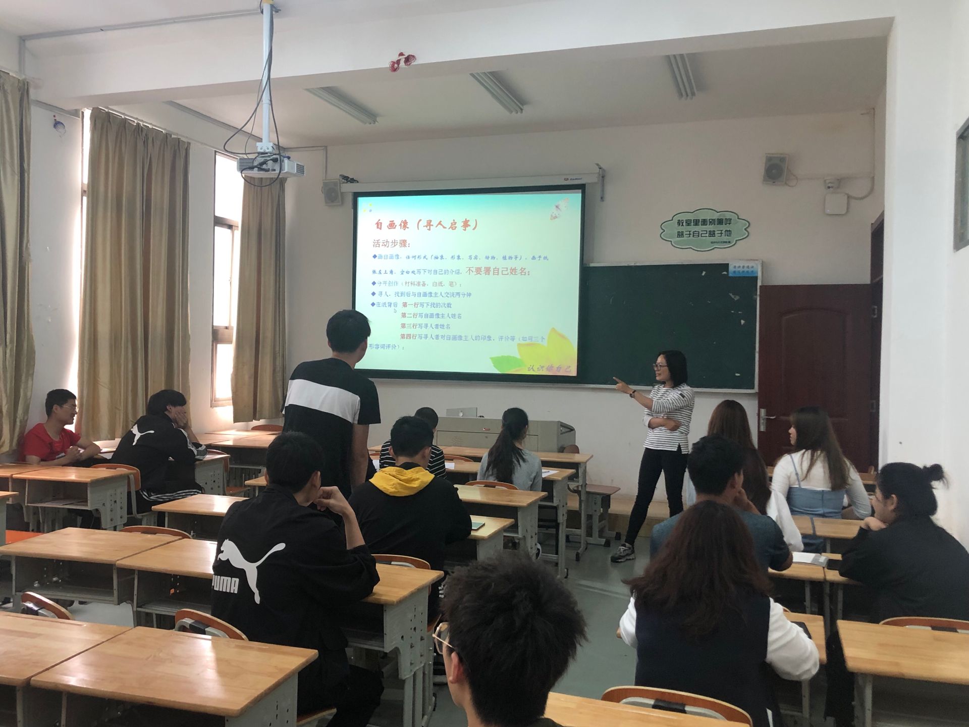 培训教师首先介绍了此次心育委员培训目的和流程,接着以实例阐述了心育干部的本职工作。最后开展了小游戏“自画像”的活动,同学们先画下自己的自画像,再由老师交给现场学生,通过自画像找到相应的人,然后阐述自己是如何辨别的。在讨论过程中,让心育干部明白如何在现实生活中去体会别人的情绪和表达方式。