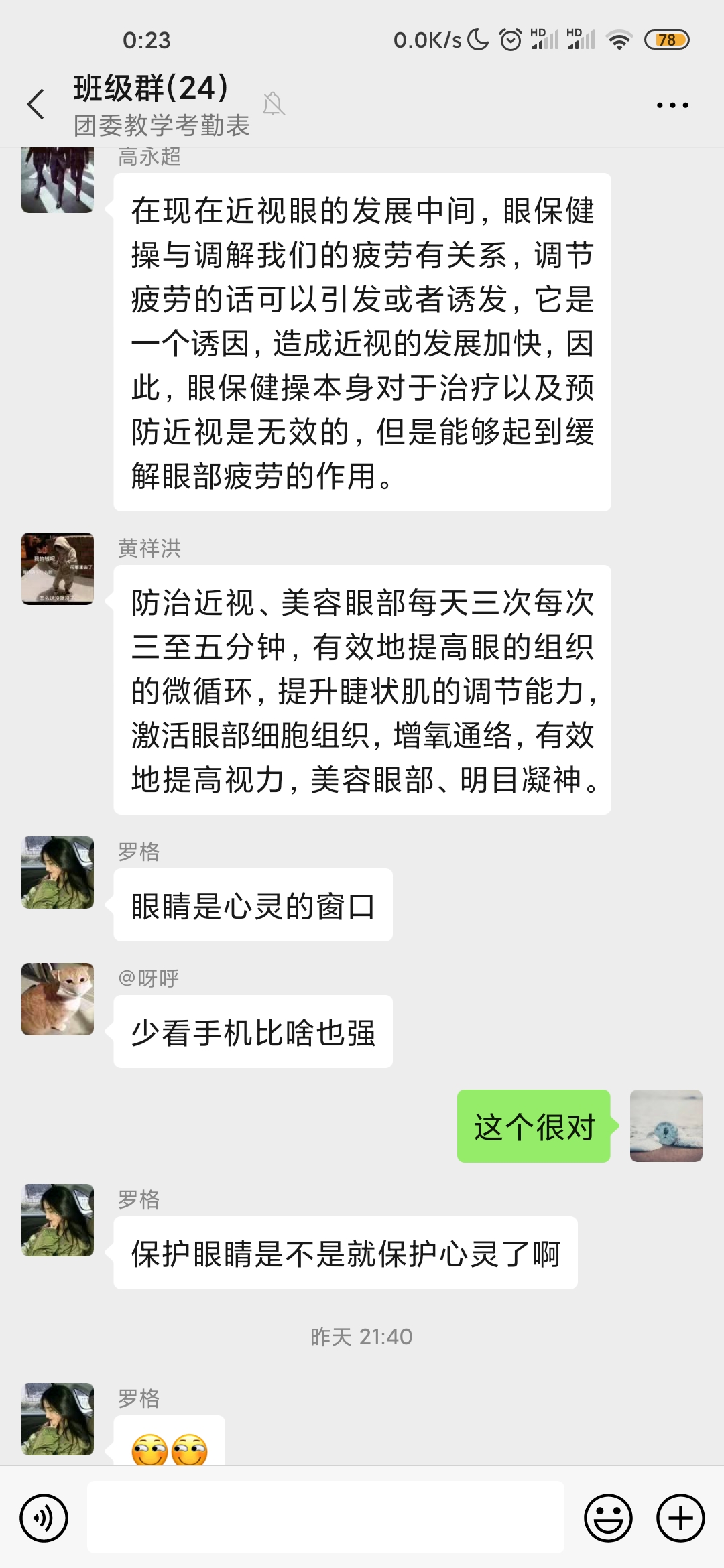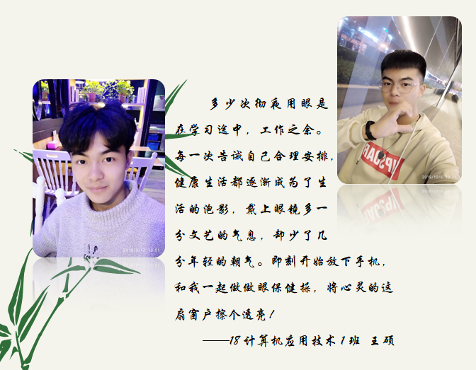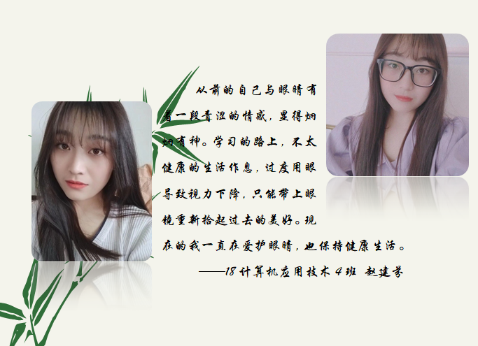 活动通过组织广大青年学子学习掌握眼保健操动作要领、今昔照片对比、展开班级讨论交流等在线平台宣传爱护眼睛、保护视力的科学知识,使大家懂得在日常生活中合理用眼、适度休息。有同学在学做眼保健操时表示:之前眼睛并没有近视,由于经常熬夜玩手机、躺着看书等不健康行为导致眼睛近视,逐渐模糊。鲜明的例子在于告诫大家爱护眼睛,爱护自己。