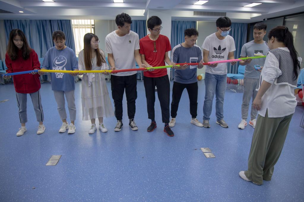 小游戏结合大知识,活动在一片掌声中拉开序幕。第一个环节在老师的指导下,同学们一字排列并保持半躺姿势,最终形成了一个闭合的“圆”。在此期间,经历了两次失败后,同学们每个人身体平稳,没有倾斜,在相互信任、团结协作的作用下大家顺利完成了挑战。随后,同学们进行了“摸着石头过河”的踩砖块小游戏,通过每个人的争分夺秒、共同努力下最终完成了环节二的比赛。此外,还进行了其他趣味性集体游戏环节。其中,转圈接力乒乓球的环节尤为使大家回味无穷,一片欢声笑语中大家逐渐懂得了互助协作的重要性。