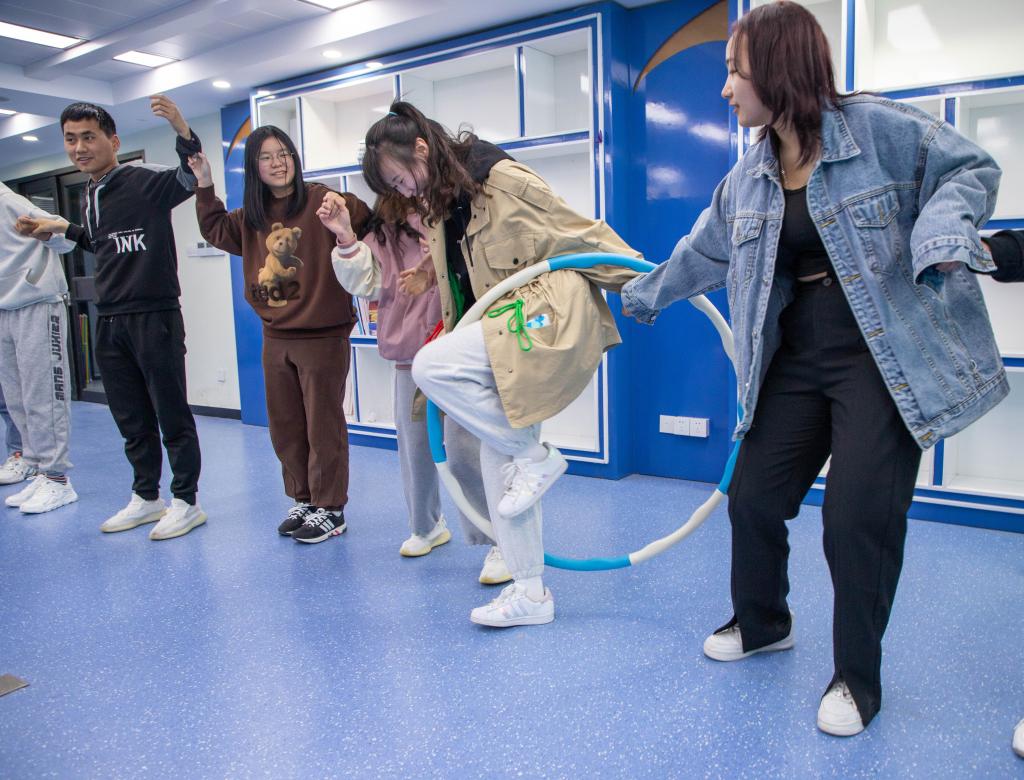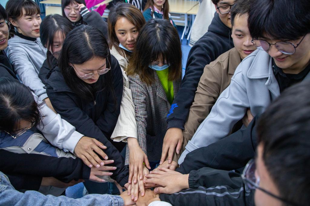 活动特邀句容市壹心关爱之家张燕老师作为团辅指导老师,活动开始,同学们围成一圈做热身小游戏,逐渐融入到团队中。随后,大家相互将手搭在前一个人肩上,通过捏捏肩膀、捶捶背的方式引导大家在欢乐的活动氛围中懂得感恩的意义。“粘年糕”抱抱团,遇见有你“取取暖”。随着活动口令,大家按照要求握手相拥,欢声笑语中也学习到了团结奋进、相互帮助的精神品质。“不倒森林”、“蒙眼捉象”环节通过钻“火车”,蹿“彩环”等小游戏带领大家感受团队协作的重要性,同时锻炼大家的反应能力和协调能力。