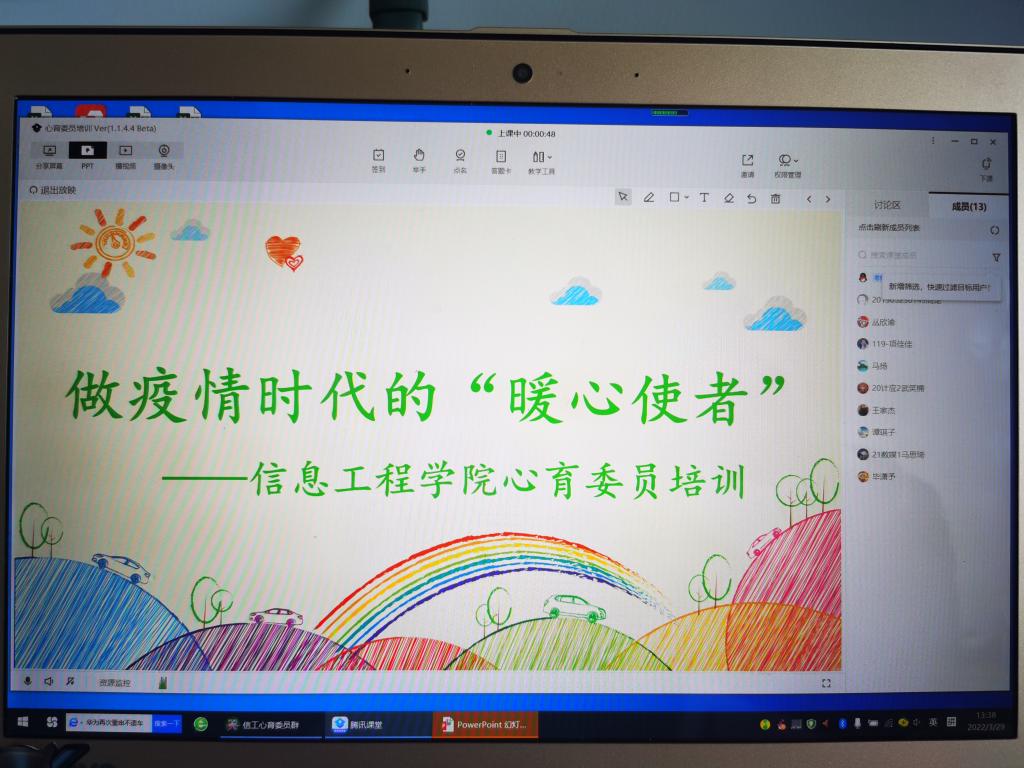 为充分发挥心育委员在校园心理健康教育中的作用,加强疫情防控期间大学生心理健康教育,信息工程学院于3月29日下午1点在腾讯课堂开展了“做疫情时代的暖心使者”---心育委员培训。