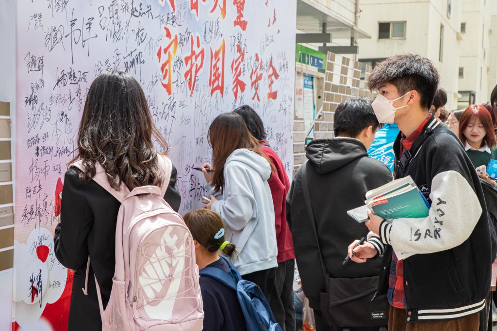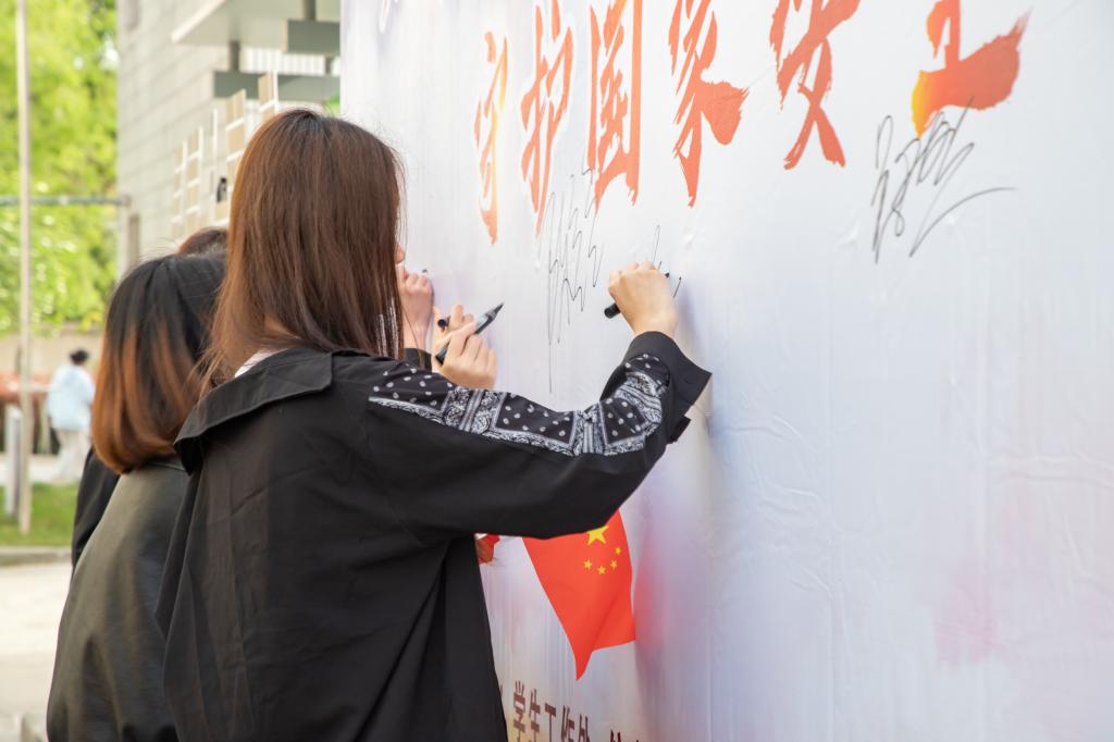 随后,开展了“我为国家安全筑长城”国家安全宣传活动,工作人员向过往学生分发国家安全宣传折页,并详细讲解国家安全知识。活动的火热氛围吸引了千余名学拿起笔,在宣传背景上写上自己捍卫国家安全的决心和信心,并在代表维护国家安全意志的“长城砖”上写上对国家安全用青春守护的铮铮誓言,贴在长城造型板上,青春的担当和使命也“砌”在了维护国家安全的“长城”上。活动现场氛围浓烈,同学们挥舞着手里的红旗,高唱《我和我的祖国》,向祖国表达最真挚的爱意。