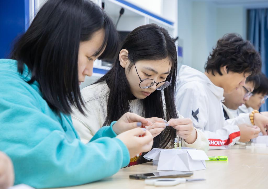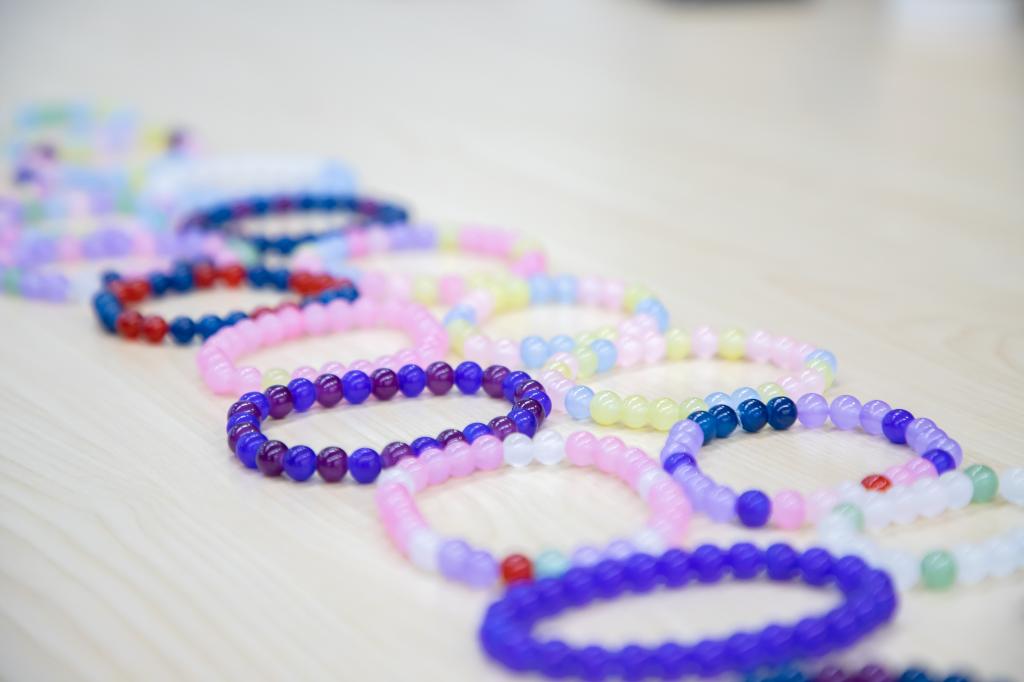 工作人员首先分步骤讲解和示范串珠的制作流程,然后,组织大家分发串珠材料包,并通过小组讨论确定分工。然后大家把珠子和花托倒在盘子上,根据珠子的大小选择合适的花托,再用引针带着弹力线把想要的珠子穿起来。大致穿好珠子后,在每个队员的手上绕一下试试大小,通过这个方法调整手串的大小,最后,一条大小适宜、独属于他们的的手串诞生了。