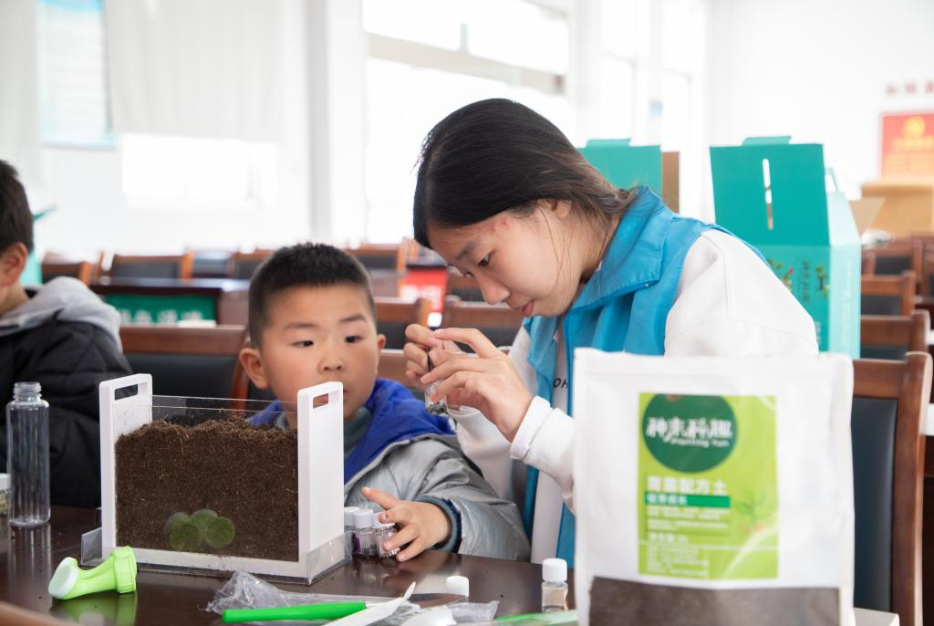 在慧农业科普小课堂活动中,志愿者用简单易懂的语言向城盖村的小朋友们普及智慧农业知识,激发了小朋友们对智慧农业的思考。课堂上,小朋友们积极地举手发言,学习氛围活跃。随后,在志愿者的帮助下,小朋友们在植物观察盒里种下春天“第一粒”种子,他们在实践中感受农业种植的快乐。