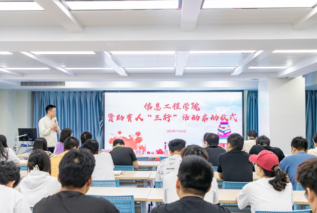 11月2日,信息工程学院资助育人“三行”活动在工科楼103启动。学院全体辅导员、班主任、学院资助宣传大使等80余名师生参加此项活动。