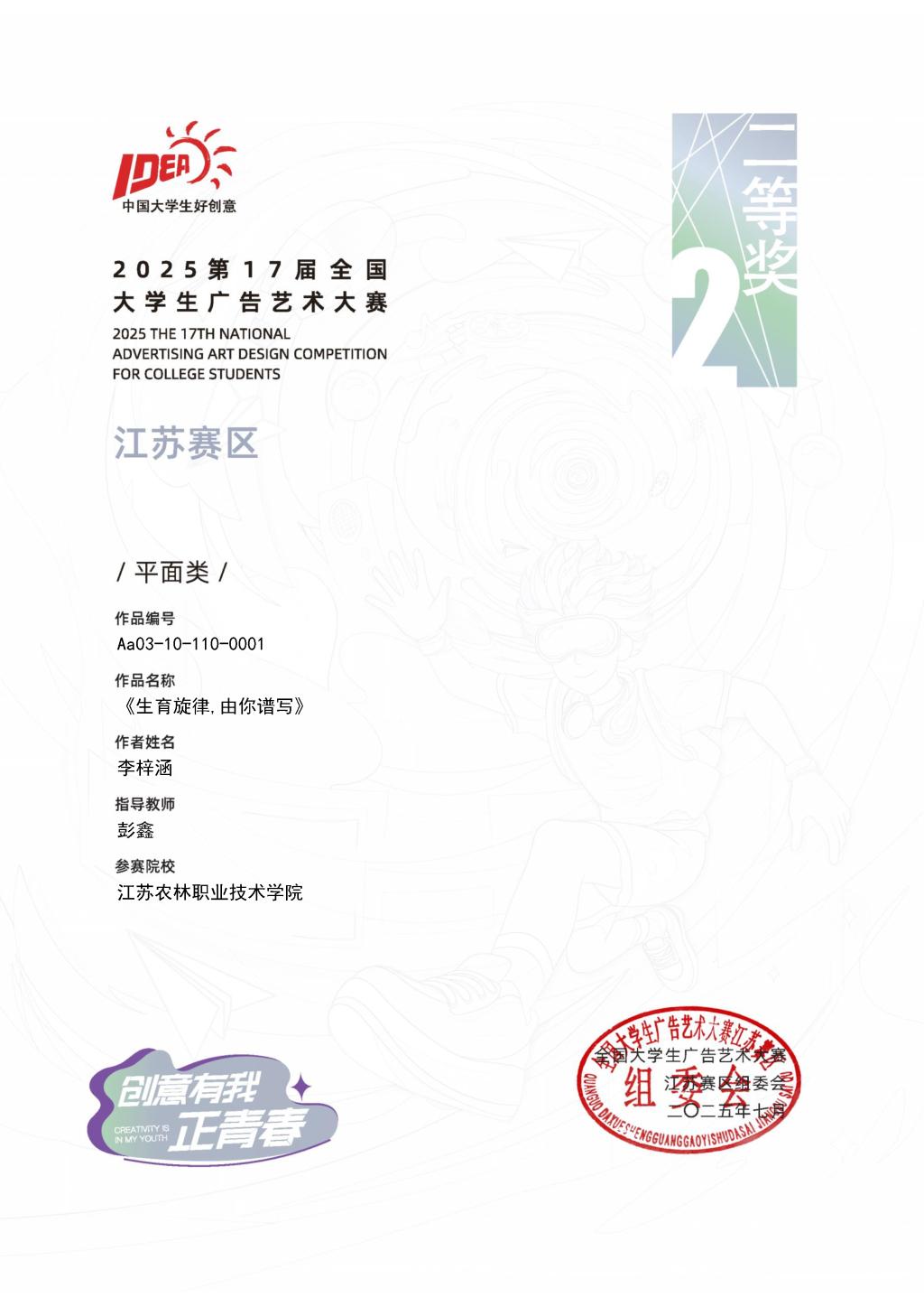 2025年7月举办的白名单赛事《第17届全国大学生广告艺术大赛》江苏赛区经过近一年的征集,盛世古德创意设计社成员李梓涵同学获得该赛事的省赛二等奖。