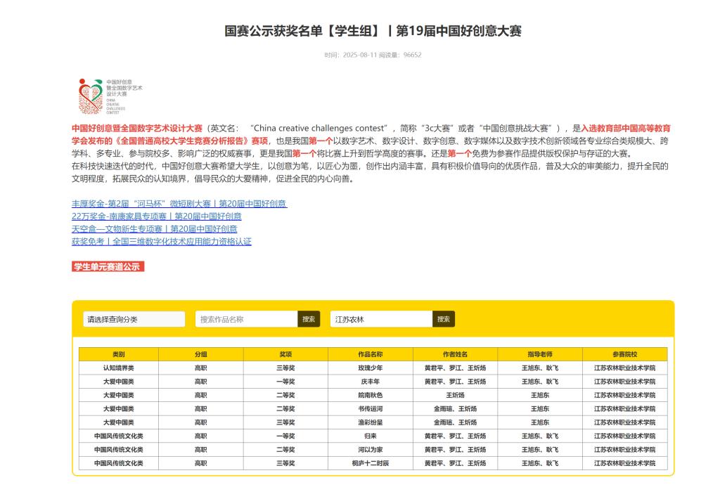 近日,第19届中国好创意(China Creative Challenges Contest,简称“3C大赛”)艺术设计大赛获奖名单正式揭晓。我校田园影像社学生在本次大赛中表现优异。在耿飞、王旭东、彭鑫等社团专业教师指导下,凭借其创新的思维、精湛的技术与独特的艺术视角,在全国众多优秀作品中脱颖而出,共斩获全国一等奖3项、二等奖4项、三等奖5项,省级奖项12项。取得历史性突破,充分彰显了我校数字媒体技术专业在“艺工融合”人才培养模式上的卓越成效。