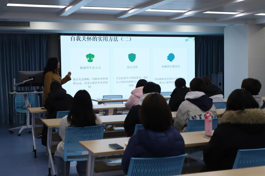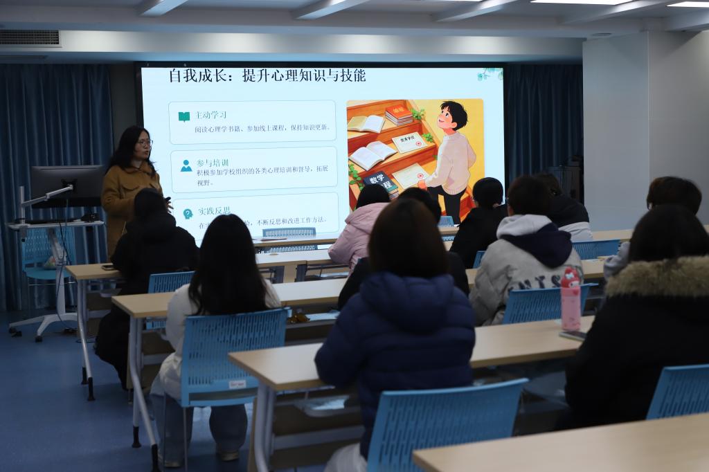培训伊始,心理老师戴老师围绕心育委员的核心使命展开讲解,强调心育委员是班级心理健康工作的“第一道防线”,是连接班主任与同学的桥梁纽带。培训包含“关注自己——心育委员的自我成长之路”、“关注同学——做温暖的陪伴者与守护者”和“心育委员的职责”三个模块,明确提出心育委员的工作原则:不做“心理医生”,做“温暖的陪伴者、积极的传递者、及时的反馈者”,在关注同学心理健康的同时,也要关照好自身的心理状态,做到“身心同频”。