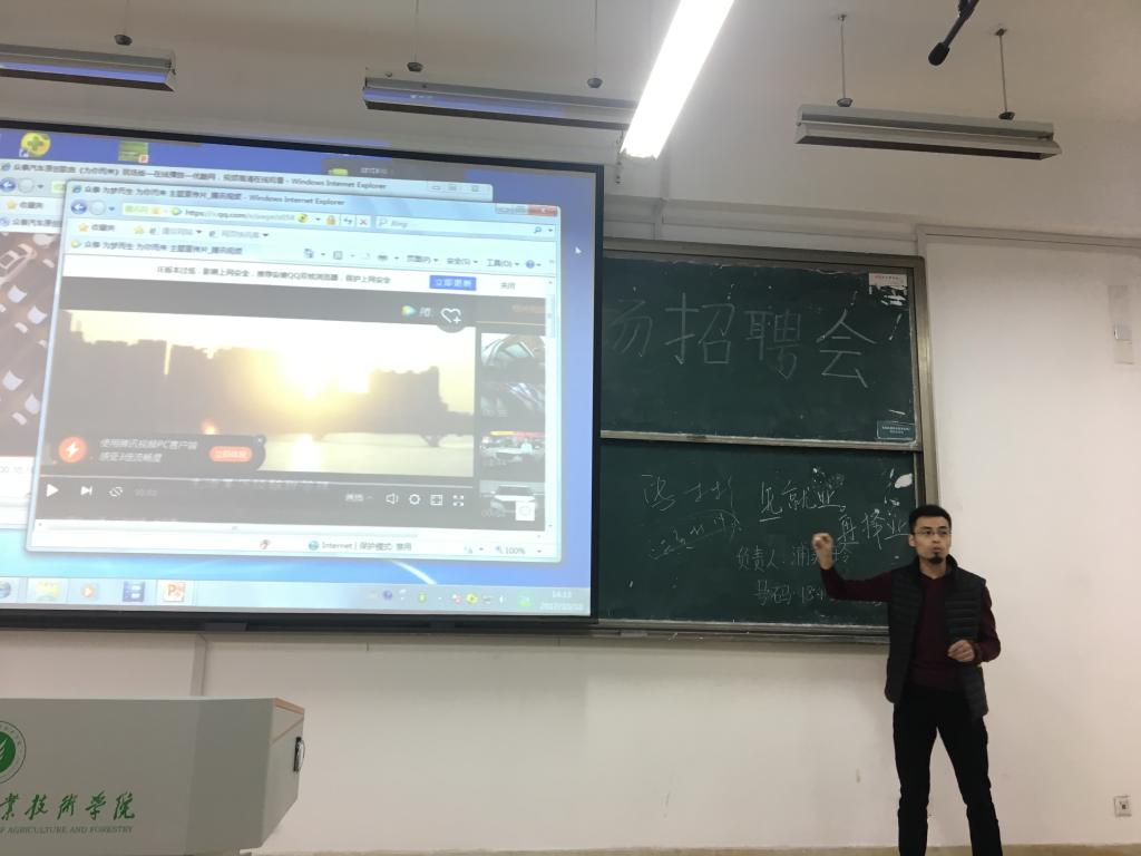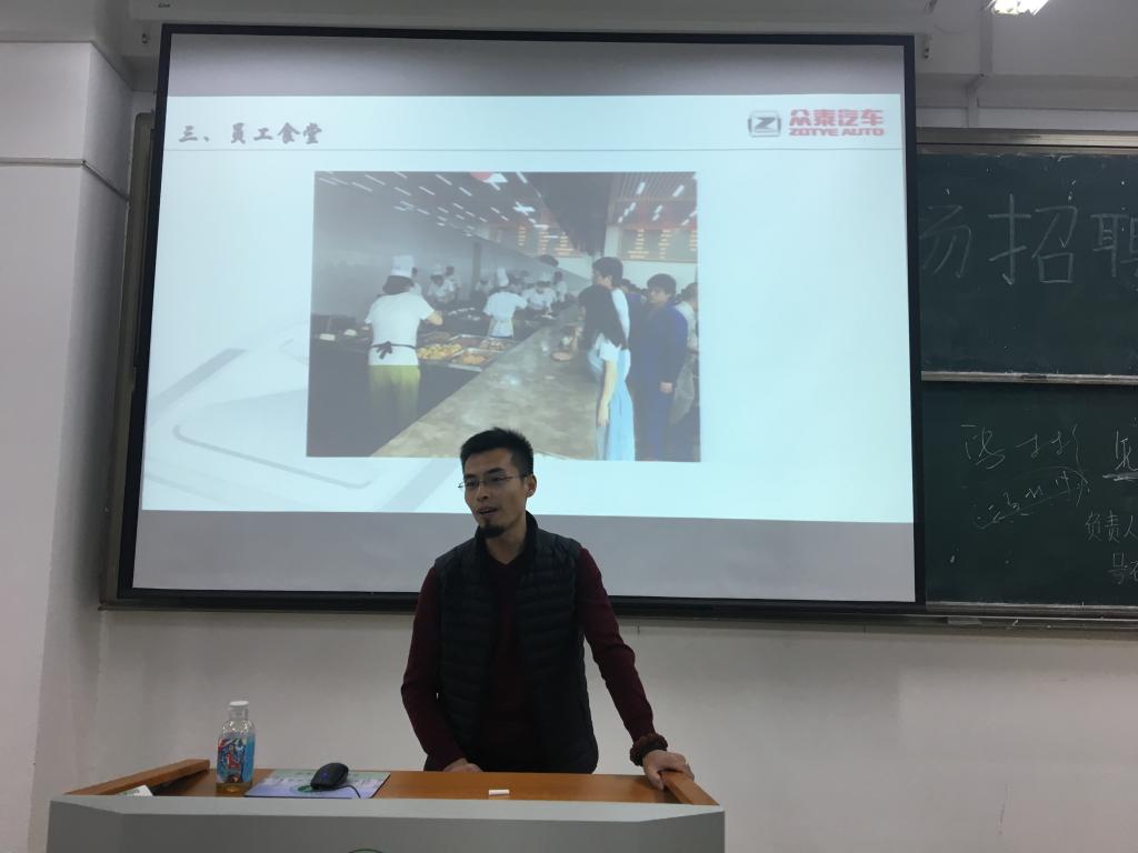 宣讲会伊始,众泰集团主讲人与大家进行了暖场互动,通过播放几段寓意深刻的小视频,引起了在场学子们的共鸣。其后,主讲人对众泰集团做了简单的介绍,包括该公司的住宿环境,食堂就餐,以及员工福利等,还有该公司今后的发展规划。最后是提问沟通环节,宣讲人热情仔细地回答了同学们提出的问题,解除了大家心中的疑惑。