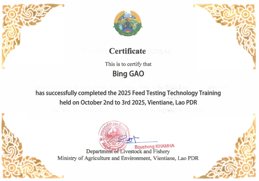 应老挝农业与环境部畜牧与渔业司动物饲料标准与分析中心的邀请,信息工程学院高冰教师于9月30日至10月5日赴老挝为60余名饲料分析相关技术人员开展饲料检测技术培训,内容包括饲料中含水量、粗灰分、粗蛋白、粗纤维、粗脂肪、砷污染、黄曲霉毒素B1、六氯联苯含量的中国标准检测方法,还将近红外光谱技术推介给老挝国家动物饲料标准与分析中心,并进行了详尽的实操培训。