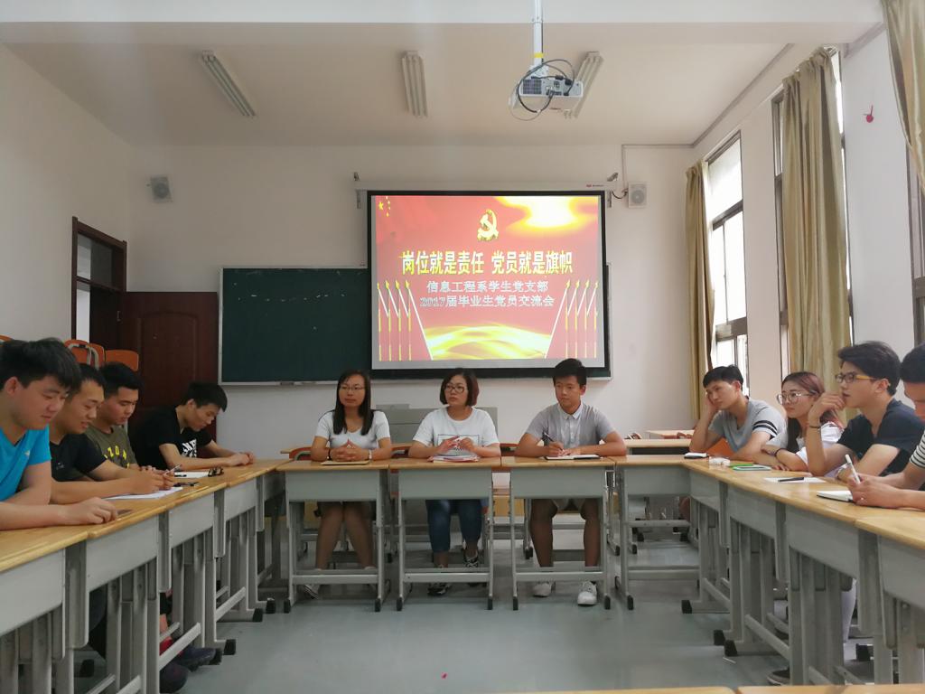 为更好推动支部的组织发展,帮助学生党员树立正确的世界观,6月14日14:00,信息工程系学生党支部在J2104开展了主题为“岗位就是责任、党员就是旗帜”毕业生党员交流活动,来自各毕业班级10名毕业生党员和在校的发展对象之间进行了充分的交流互动。