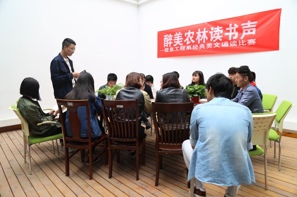 为提高大学生文化素养,引导大学生对经典文学艺术的认识,5月7日14:00,信息工程系分团委在工科楼5楼阳光房举行“醉美农林读书声”经典诗文诵读比赛。系部12名朗读爱好者参加了此次比赛。