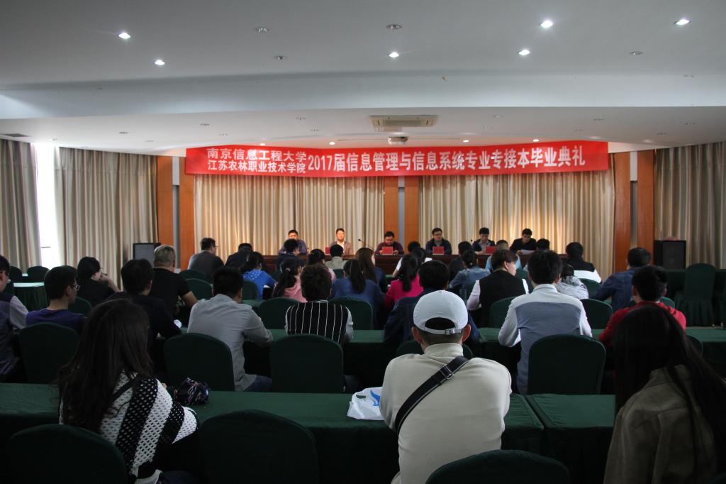 2017年5月2日10:00,南京信息工程大学、江苏农林职业技术学院2017届信息管理与信息系统专业专接本毕业论文答辩工作在J1B308-310有序开展。下午2:00毕业典礼在继续教育学院水榭厅隆重举行。典礼由信息工程系副主任田崇峰主持,学院继续教育学院副院长杨俊、信息工程系主任吴刚山、副主任经松、物联网教研室江进出席毕业典礼,2017届65名专接本毕业生将从这里起航,开始人生新的征程。