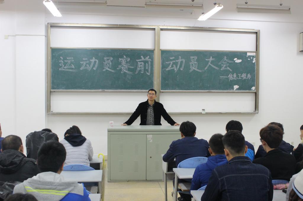 在院运动会到来之际,为给全体运动员加油鼓劲,4月11日中午,信息工程系在J1A203教室召开了运动员赛前动员大会,系党总支副书记陈兵出席了本次大会并发表讲话,所有运动员参加了本次大会。