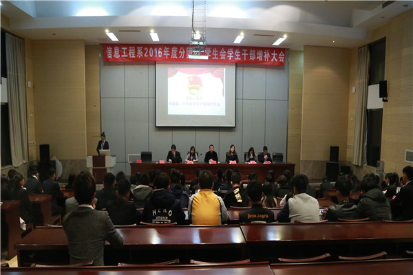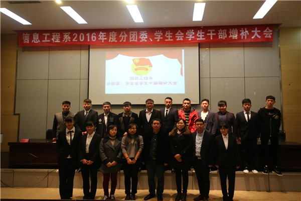 2016年11月10日18:30,信息工程系第十届分团委、学生会学生干部增补会议在研发楼报告厅隆重召开。信息工程系党总支副书记陈兵老师、分团委书记兼学工办主任张媛老师以及全体辅导员老师出席了此次会议。