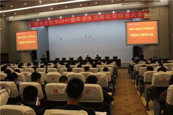 信息工程系于2016年11月7日图书馆报告厅举办了2017届毕业生顶岗实习动员大会。信息工程系主任吴刚山,副主任田崇峰,副书记陈兵和各教研室主任、学工办辅导员、各班主任,2017届信息工程系全体同学参加会议,会议由陈兵书记主持。