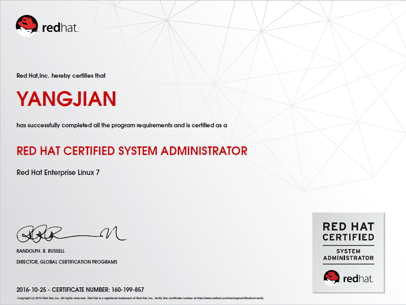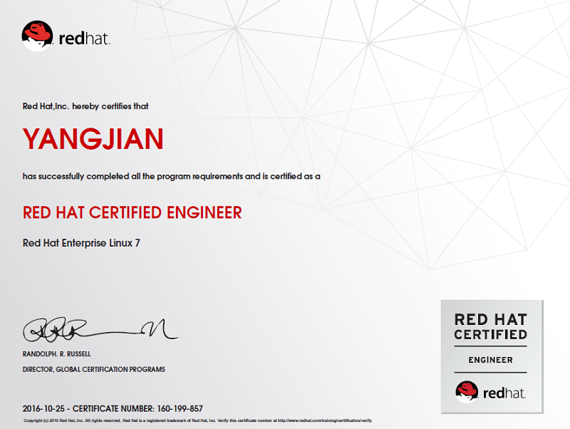 近日,信息工程系杨健老师以满分通过红帽认证系统管理员(RHCSA)和红帽认证工程师(RHCE)考试,并获得相应认证证书。