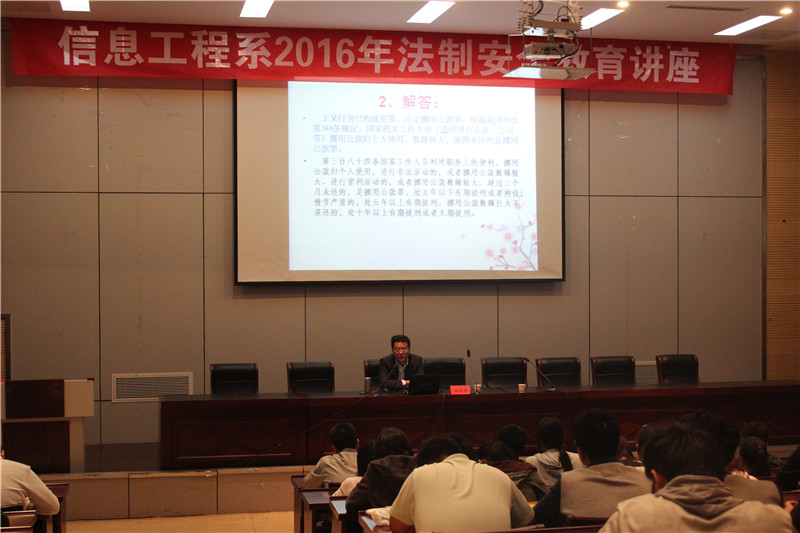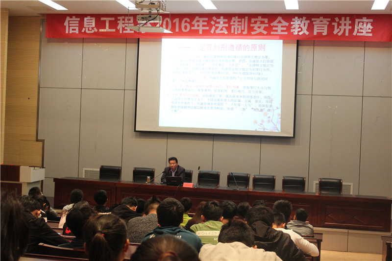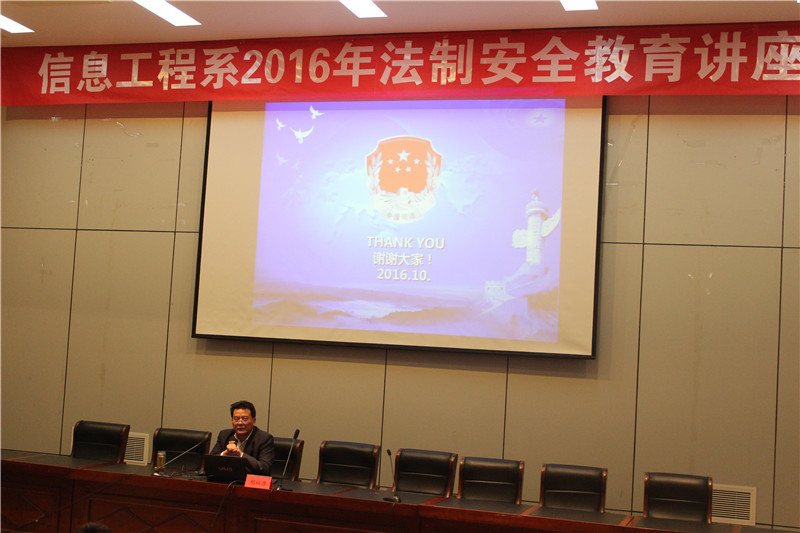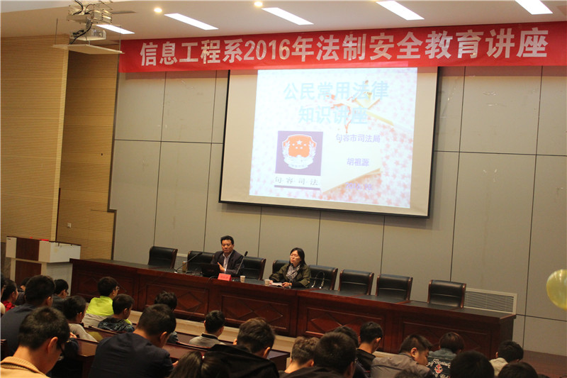 10月25日,信息工程系在研发楼报告厅开展2016年度法制安全教育讲座。本次讲座邀请了句容市司法局基层工作胡祖源,从事司法行政工作30年,是中国法学会会员。常年奋战在法制宣传一线,大力开展“法律八进”,为全市的普法宣传工作做出突出贡献。先后荣获三次三等功,被评为江苏省“六五”普法中期先进个人。