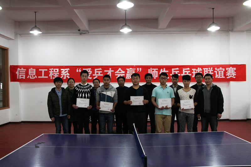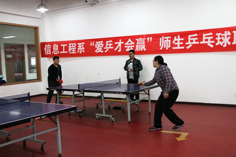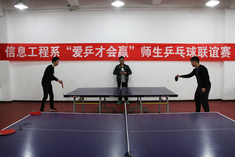 为加强老师与学生之间的联系,增进师生情谊。3月23日下午,信息工程系分工会、分团委在体育馆乒乓球室举办了“爱乒才会赢”师生乒乓球联谊赛。院工会江德明主席参加了此次联谊赛,系田崇峰副主任以及系部分老师和各班级的优秀乒乓球选手参与了此次比赛。