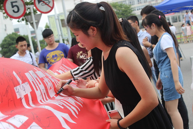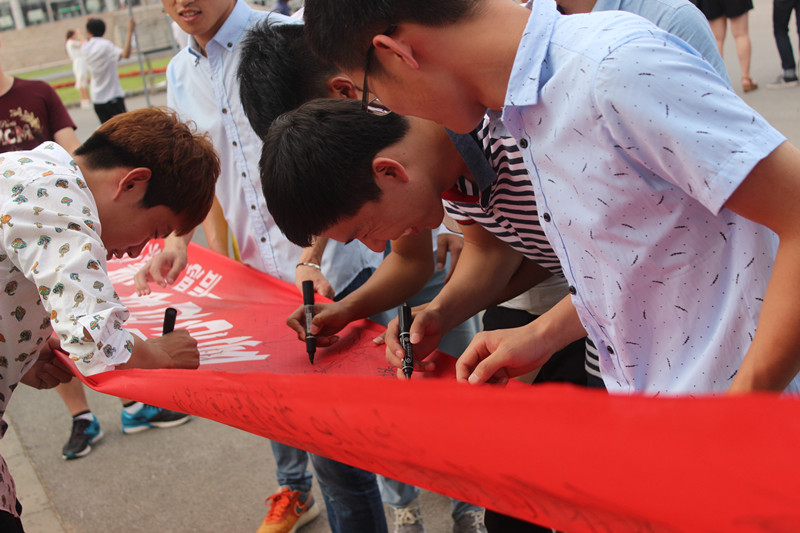 毕业生们激情高昂在横幅上签字,他们纷纷表示虽然即将离校,但是一定会遵守学院的相关规章制度,做到有序文明离校,并表达了对母校的真切祝福。