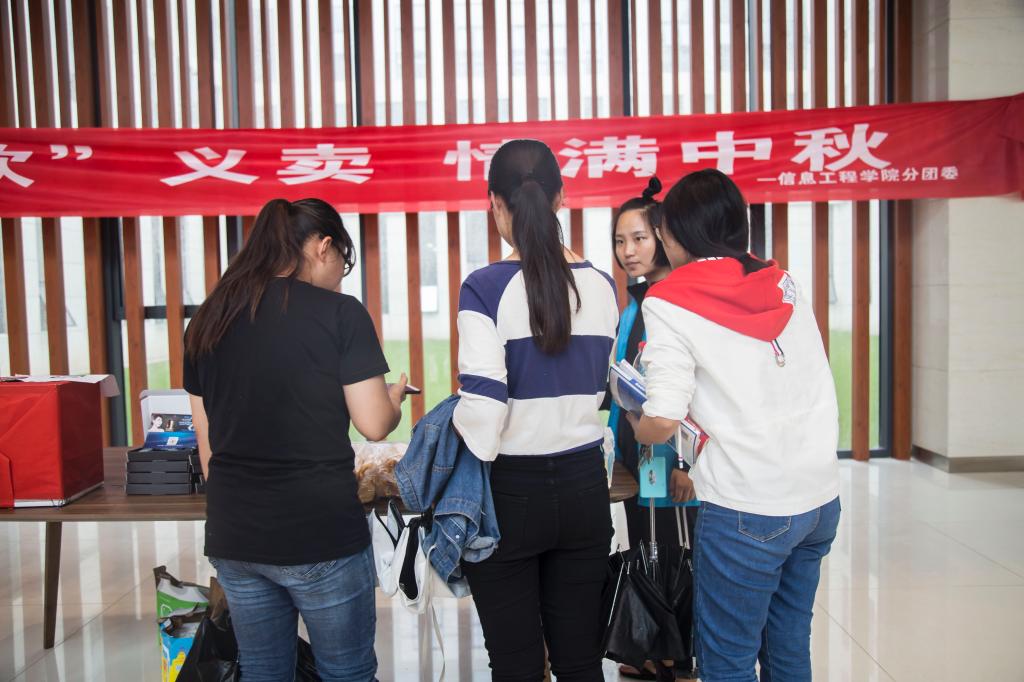 9月25日11:40,志愿者们分别在食堂门口、工科楼大厅开展了爱“欣”义卖活动。当天虽然暴雨磅礴,但是也浇不灭志愿者的热情,现场义卖物品有社会机构捐助的蛋糕、青年志愿者亲手做的手工饰品、新媒体工作室的艺术摄影券等。当天义卖募捐善款2200元。